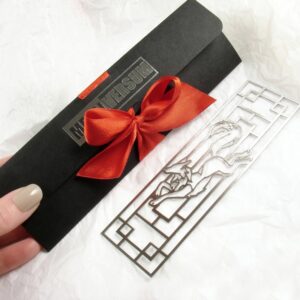 Nasze zakładki do książek zawsze wysyłamy pięknie spakowane. Zaprojektowaliśmy dla nich i wdrożyliśmy klasycznie czarne papierowe etui. Są one wykonywane z barwionego w masie papieru Pergraphica 350g/m2. Wysoka gramatura sprawia, że te przypominające koperty opakowania są sztywne a co za tym idzie – trwałe. Można ich używać jako etui do zakładek. Z uwagi na barwienie w masie, papier nie ma widocznych białych krawędzi – jest po prostu jednolicie czarny i bardzo elegancki. Dodam też, że Pergraphica jest papierem ozdobnym o wyjątkowej gładkości, dzięki czemu opakowania nie tylko pięknie wyglądają, ale też są niezwykle przyjemne w dotyku. Przysłowiową kropką nad i są czerwone wstążki, którymi przewiązujemy opakowania, co sprawia, że każdy pakuneczek z zakładką wewnątrz idealnie nadaje się do wręczenia na prezent.