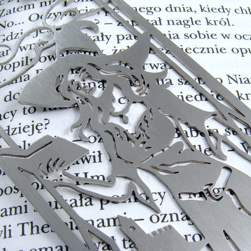 Ta ażurowa zakładka do książki przesycona jest symboliką niczym karta tarota. Piękna czarodziejka z książką czyta inkantację a nad nią gromadzą się chmury. Księżyc przesłania Słońce. Magiczce towarzyszy ogień i zwierzęta kojarzące się z nocą a w oddali, na wzniesieniu piętrzy się zamek… to mogłaby być niezła książka… aż chciałoby się dopowiedzieć dalszą część historii!