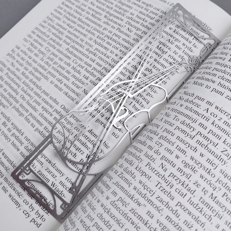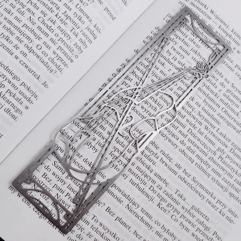 Podobnie jest z książkami, zatem dlaczego nie połączyć tych dwóch światów? Muzyczna zakładka do książek ze skrzypcami to coś dla miłośników klasycznej muzyki i klasycznej literatury, albo dla fana porywających ścieżek dźwiękowych i pełnych przygód powieści lub wartkich thrillerów. Delikatne stalowe linie wydobywają z płaskiego kawałka blachy przestrzenny zarys instrumentu. Subtelnie secesyjna ramka, jakby była upleciona ze strun, domyka zwartą, prostą formę zakładki. Ten instrumentalno-literacki gadżet z pewnością przypadnie do gustu koneserowi dobrej książki i dźwięku.