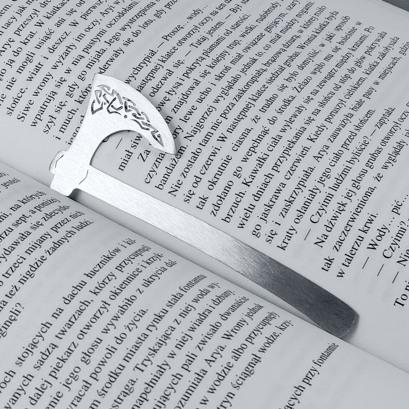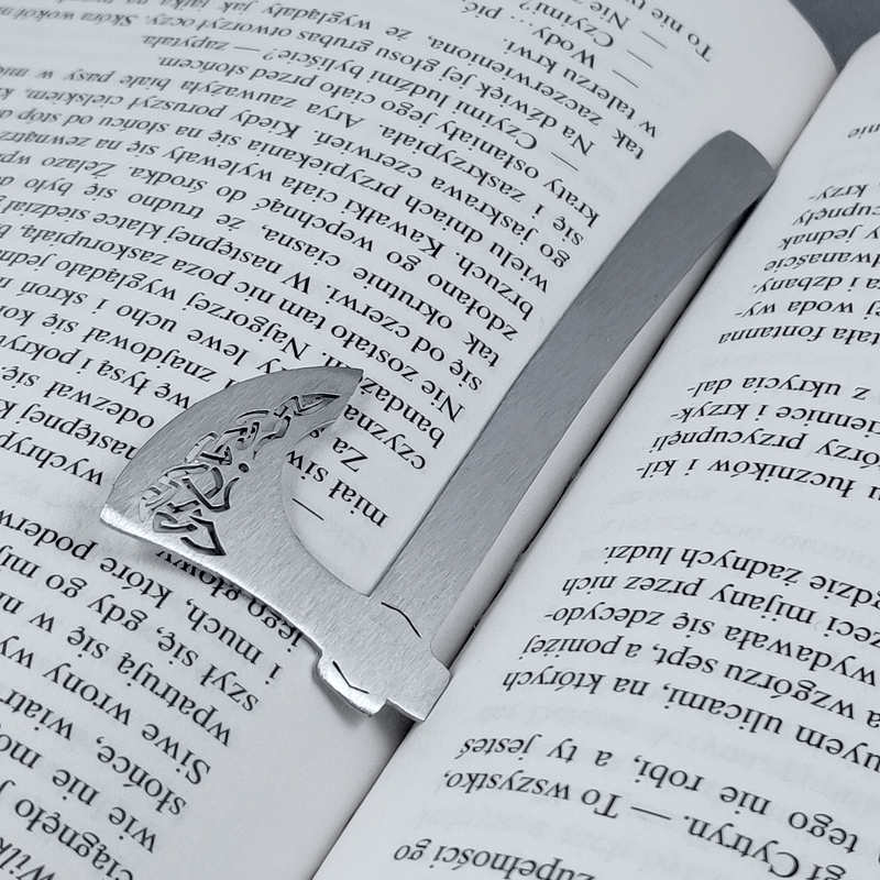 Oryginalna zakładka do książki z wczesnośredniowiecznym zacięciem. Inspirowany dawną kulturą skandynawską bojowy topór o asymetrycznym żelaźcu (głowni) ozdobionej ażurowym przeplatającym się ornamentem. Delikatnie zagięte toporzysko (trzonek) zapewnia dobry chwyt i odpowiednią dźwignię, by powalić nawet najbardziej opasłe tomisko. Zatem jeśli interesujesz się historią i kulturą ludów dawnej Europy, rekonstrukcją historyczną albo po prostu lubisz średniowieczny klimat w powieściach fantasy, to może być ciekawy przerywnik do twojej lektury.